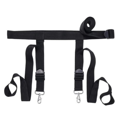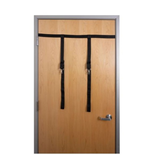Control meets convenience. Turn any door into a secure point of restraint. The Edge® Adjustable Door Restraints feature a reinforced, adjustable strap that cinches around the door and two adjustable, slidable straps that drape over the top, each fitted with a heavy-duty gate clip ready to connect to your favorite cuffs. Compatible with most door types, from interior to barn and beyond, this setup delivers strength, versatility, and control anywhere you want it. Cuffs not included. Features: Adjustable reinforced horizontal strap anchors securely around the door Two adjustable over-the-door straps fitted with heavy-duty gate clips Fully adjustable design compatible with any standard door Materials: 78% Polypropylene,12% Steel, 10% POM